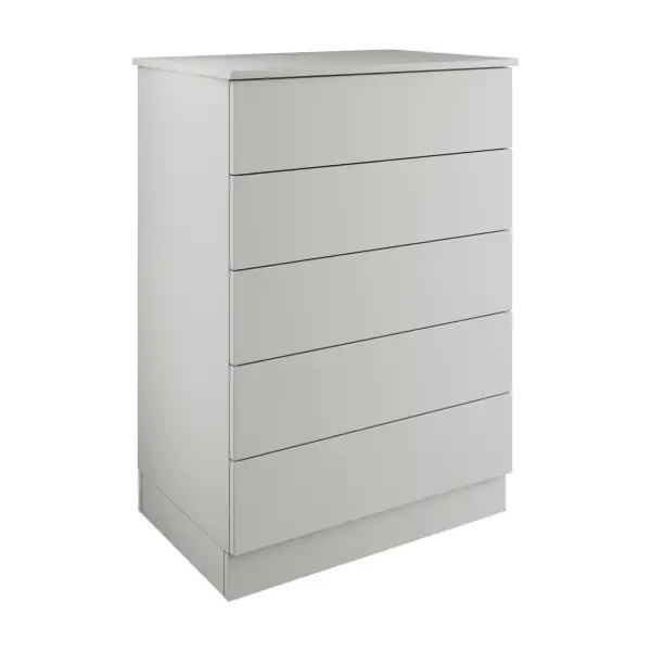 The classic / shaker light grey 5-drawer tallboy chest comes with MDF slab style drawer fronts drawer fronts in a standard matt finish, light grey chest and soft close drawer runners. The flatpack quick build chest is delivered to a room of your choice. The bedroom furniture can be used for freestanding purposes or joined together to achieve a built-in look. Everything is manufactured to the highest standard in the UK using FSC material with a 10 year manufacturer guarantee. Please note, handles sold separately.