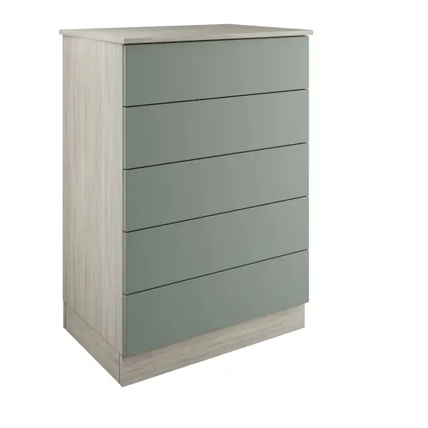 The classic / shaker sage green 5-drawer tallboy chest comes with MDF slab style drawer fronts drawer fronts in a standard matt finish, urban oak chest and soft close drawer runners. The flatpack quick build chest is delivered to a room of your choice. The bedroom furniture can be used for freestanding purposes or joined together to achieve a built-in look. Everything is manufactured to the highest standard in the UK using FSC material with a 10 year manufacturer guarantee. Please note, handles sold separately.