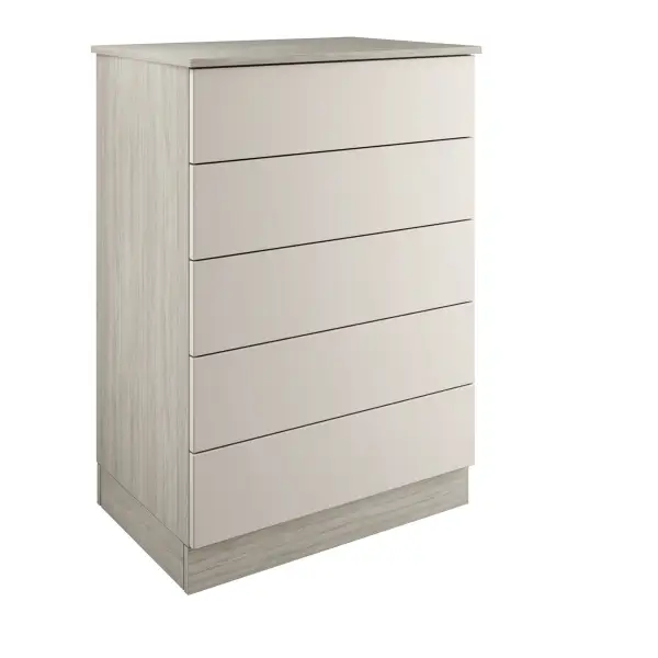 The classic / shaker taupe grey 5-drawer tallboy chest comes with MDF slab style drawer fronts drawer fronts in a standard matt finish, urban oak chest and soft close drawer runners. The flatpack quick build chest is delivered to a room of your choice. The bedroom furniture can be used for freestanding purposes or joined together to achieve a built-in look. Everything is manufactured to the highest standard in the UK using FSC material with a 10 year manufacturer guarantee. Please note, handles sold separately.