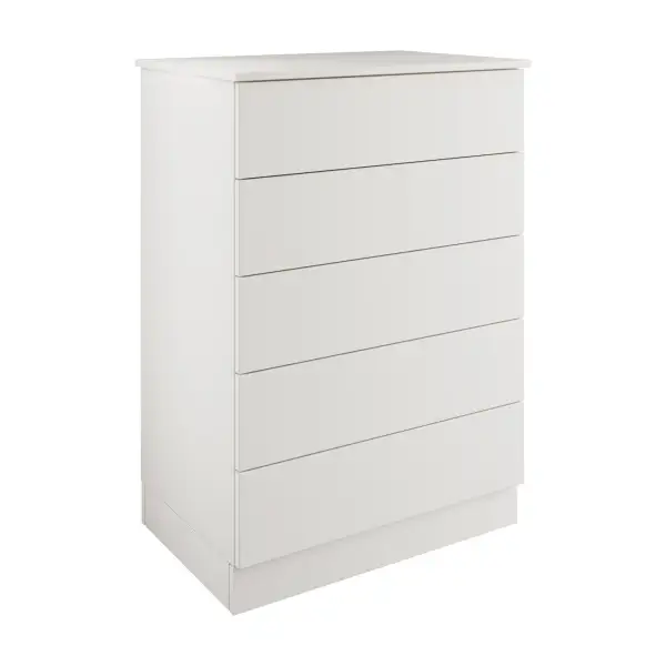 The classic / shaker white 5-drawer tallboy chest comes with MDF slab style drawer fronts drawer fronts in a standard matt finish, white chest and soft close drawer runners. The flatpack quick build chest is delivered to a room of your choice. The bedroom furniture can be used for freestanding purposes or joined together to achieve a built-in look. Everything is manufactured to the highest standard in the UK using FSC material with a 10 year manufacturer guarantee. Please note, handles sold separately.