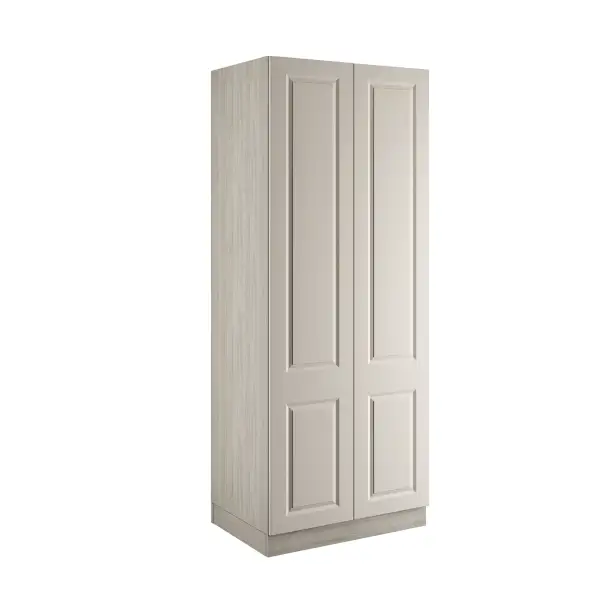 A taupe grey double wardrobe with double rail, that comes with MDF classic square frontals in a luxurious super matt finish, a urban oak cabinet and soft close hinges. The flatpack quick build cabinet is delivered to a room of your choice. The modular furniture can be used for freestanding purposes or joined together to achieve a built-in look. Everything is manufactured to the highest standard in the UK using FSC material with a 10 year manufacturer’s guarantee. Please note, handles sold separately.