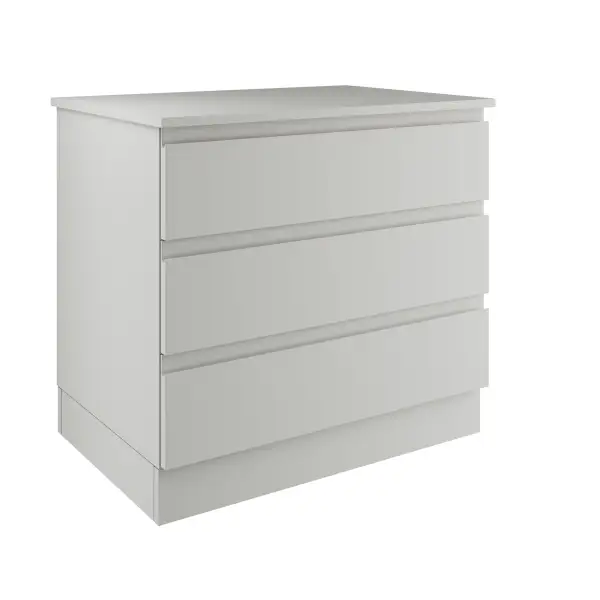 The light grey 3-drawer double chest comes with MDF J-Pull frontals drawer fronts in a luxurious super matt finish, light grey chest and soft close drawer runners.