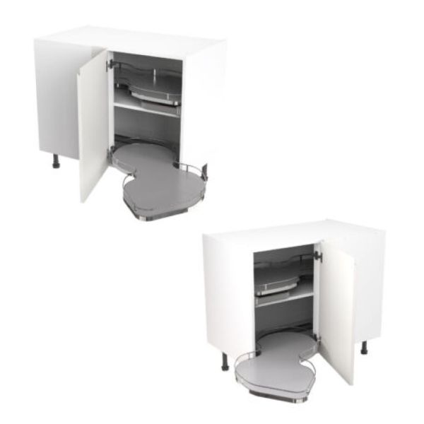 - Nuvola Blind Corner Swivel-action baskets attached to cabinet bottom and shelf. 12mm Grey MFC Base with Chrome finish surround