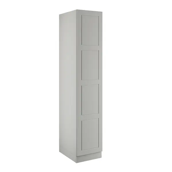 A light grey single wardrobe with single rail, that comes with MDF 4 panel shaker frontals in a standard matt finish, a light grey cabinet and soft close hinges. The flatpack quick build cabinet is delivered to a room of your choice. The modular furniture can be used for freestanding purposes or joined together to achieve a built-in look. Everything is manufactured to the highest standard in the UK using FSC material with a 10 year manufacturer’s guarantee. Please note, handles sold separately.