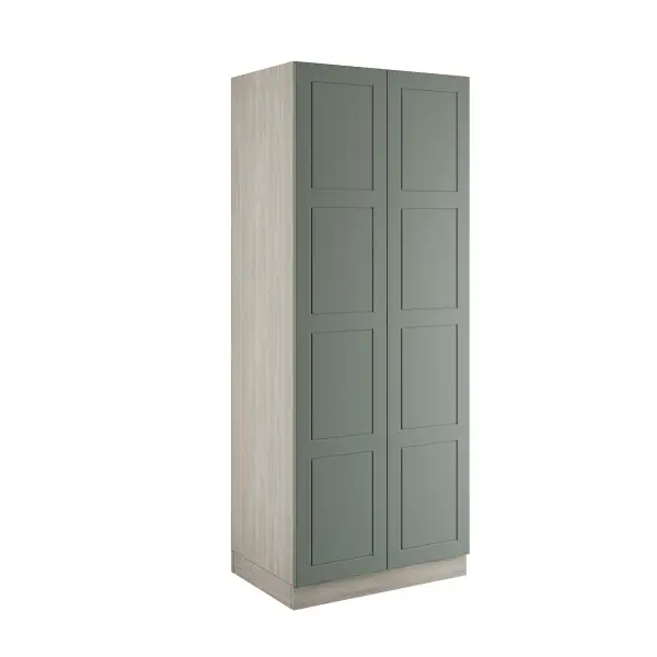 A sage green double wardrobe with double rail, that comes with MDF 4 panel shaker frontals in a standard matt finish, a urban oak cabinet and soft close hinges. The flatpack quick build cabinet is delivered to a room of your choice. The modular furniture can be used for freestanding purposes or joined together to achieve a built-in look. Everything is manufactured to the highest standard in the UK using FSC material with a 10 year manufacturer’s guarantee. Please note, handles sold separately.