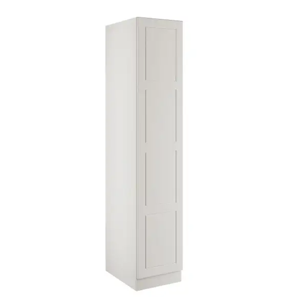 A white single wardrobe with shelves, that comes with MDF 4 panel shaker frontals in a standard matt finish, a white cabinet and soft close hinges. The flatpack quick build cabinet is delivered to a room of your choice. The modular furniture can be used for freestanding purposes or joined together to achieve a built-in look. Everything is manufactured to the highest standard in the UK using FSC material with a 10 year manufacturer’s guarantee. Please note, handles sold separately.